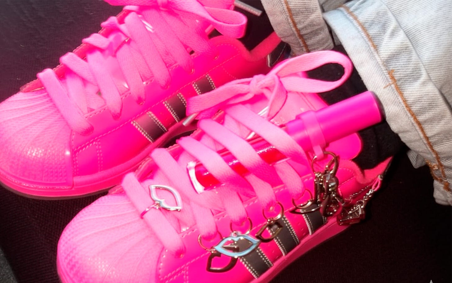 O destaque da collab é a edição limitada do tênis adidas Superstar em tom rosa com detalhes metálicos e aplicações inspiradas na linguagem visual da Boca Rosa, incluindo mini‑bocas e acabamento vinílico pensado tanto para estética quanto para uso intensivo em festas.