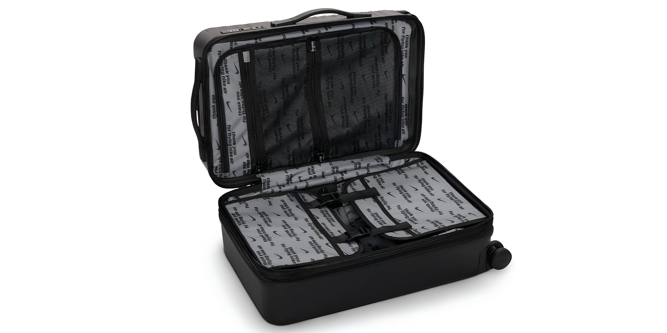 Por dentro, o acabamento também se destaca. Há divisórias com zíper, bolsos internos e forro estampado com a frase “Thank you for flying Nike Air”, uma piscada para os fãs da cultura sneaker.