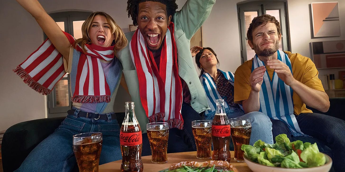 A iniciativa segue uma lógica recorrente nas campanhas da Coca-Cola em grandes eventos esportivos: levar o clima do estádio para o cotidiano do consumidor, usando embalagem como mídia e como extensão da narrativa da campanha.