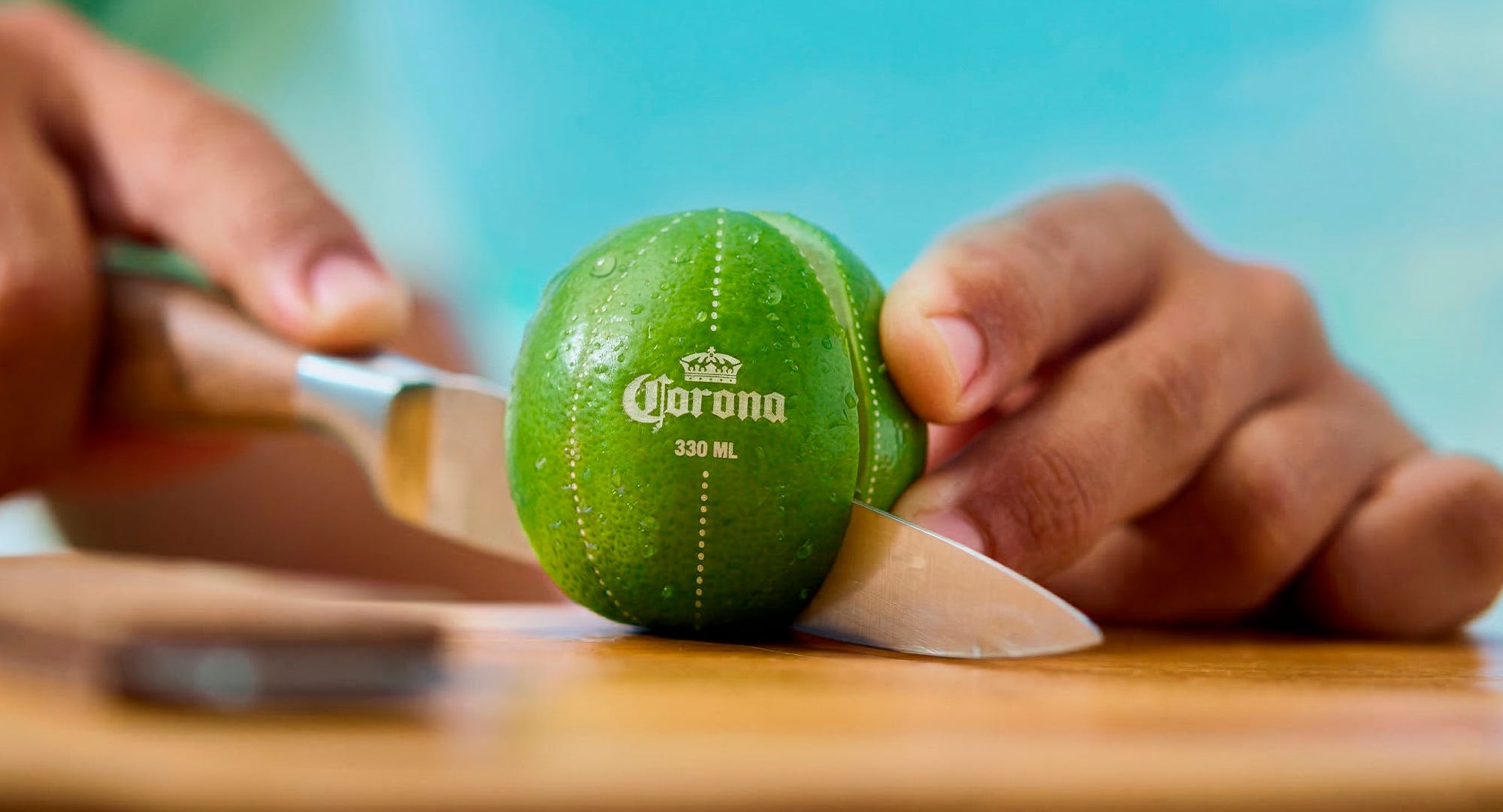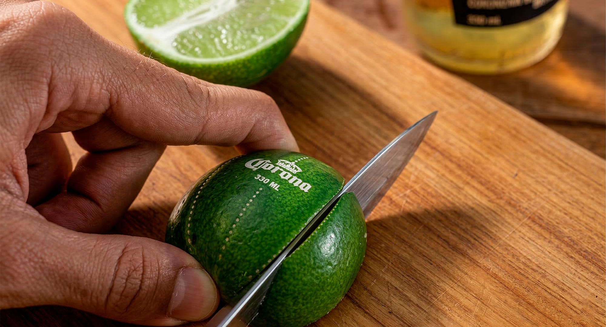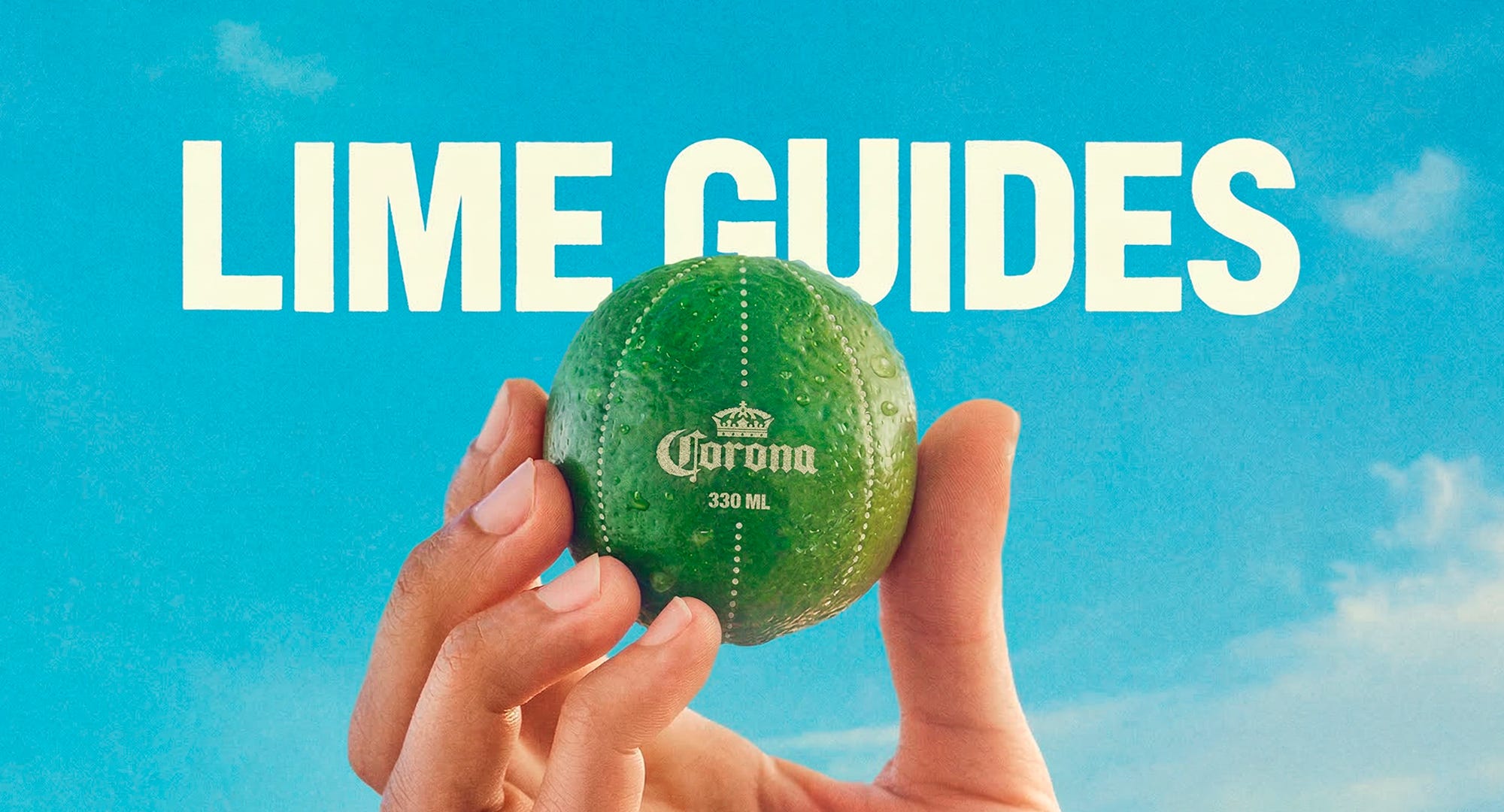 A Corona apresentou a campanha “Lime Guides” partindo de uma fricção simples e recorrente: a dificuldade de cortar o limão no tamanho exato para encaixá-lo na garrafa. A solução foi gravar, com laser seguro para alimentos, linhas de corte diretamente na casca de limões reais.