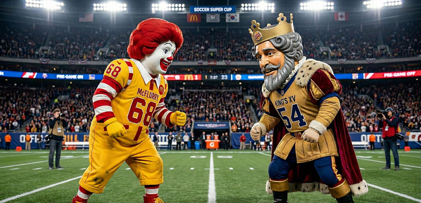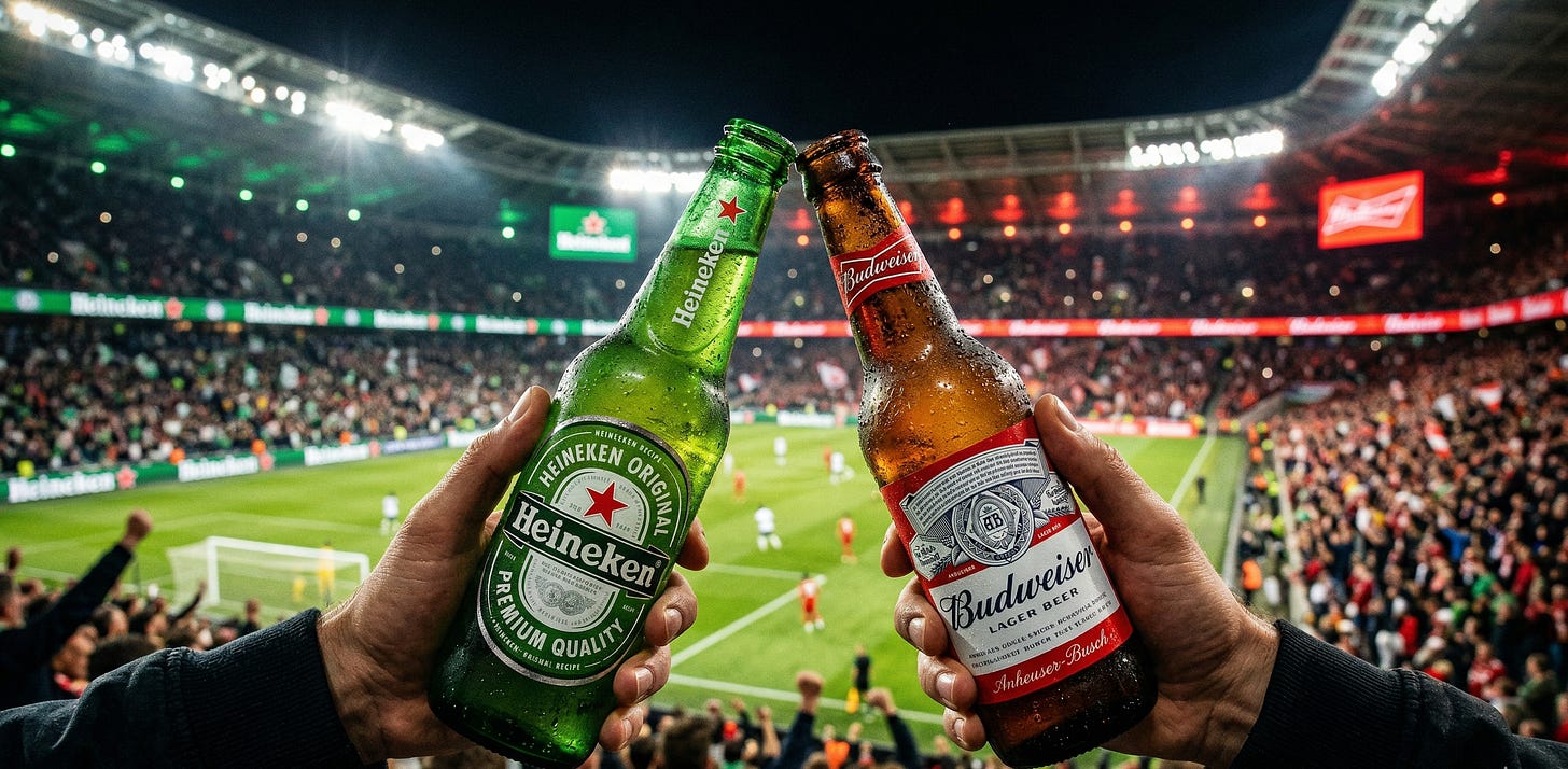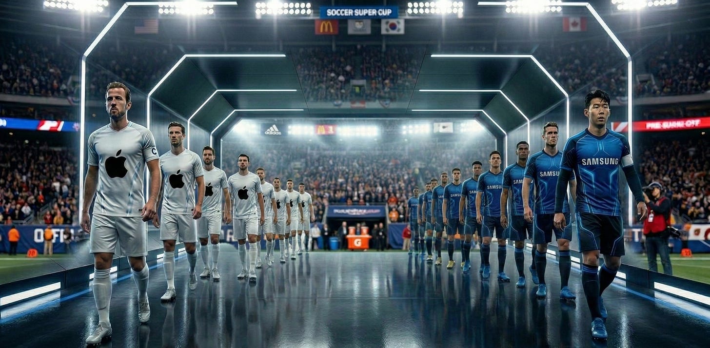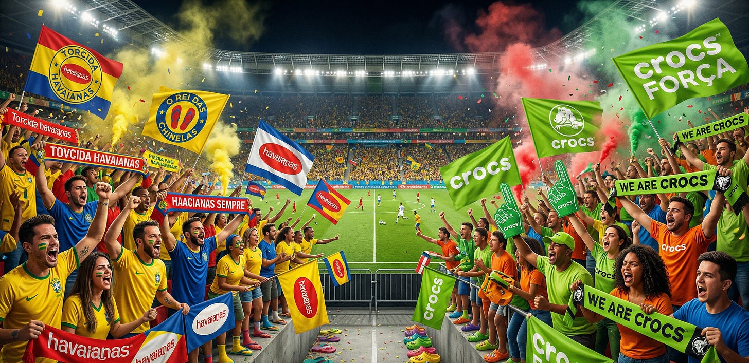 Imagine e se ao invés de seleções, a Copa colocasse marcas em campo, como Coca-Cola x Pepsi ou Nike x Adidas; Apple x Samsung; McDonald’s x Burger King; Havaianas x Crocs; Netflix x Disney+. Uber x 99; iFood x Rappi; Heineken x Budweiser; Google x Microsoft…