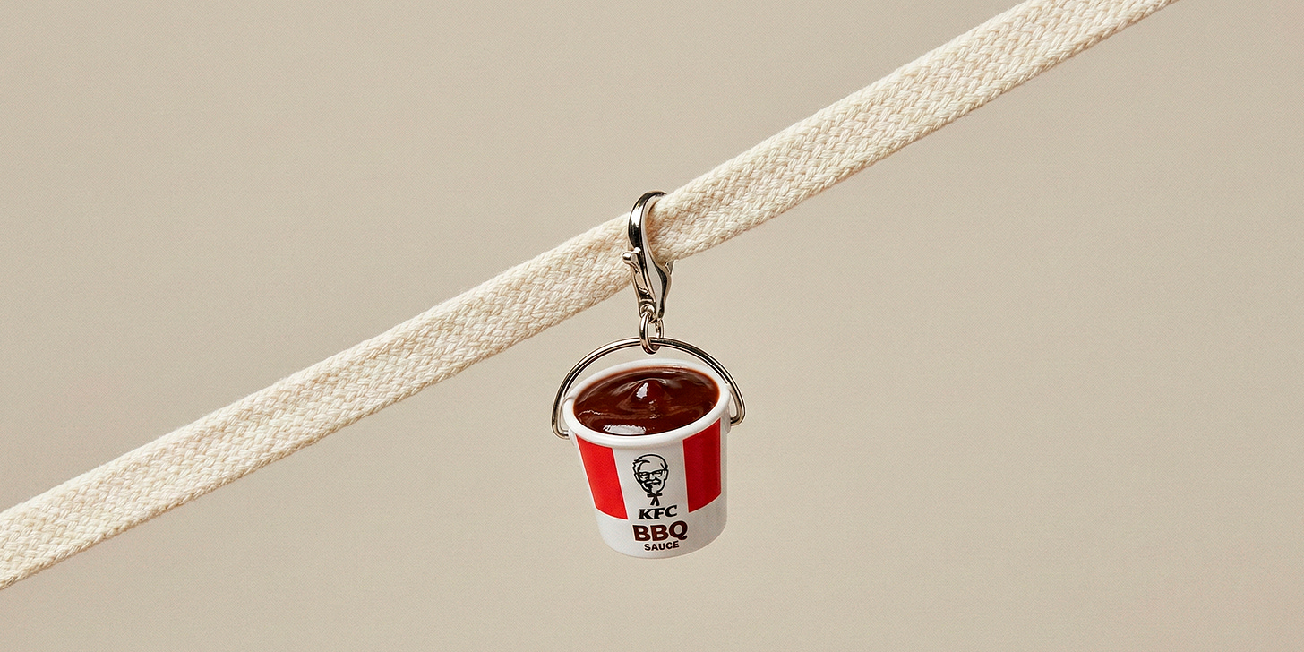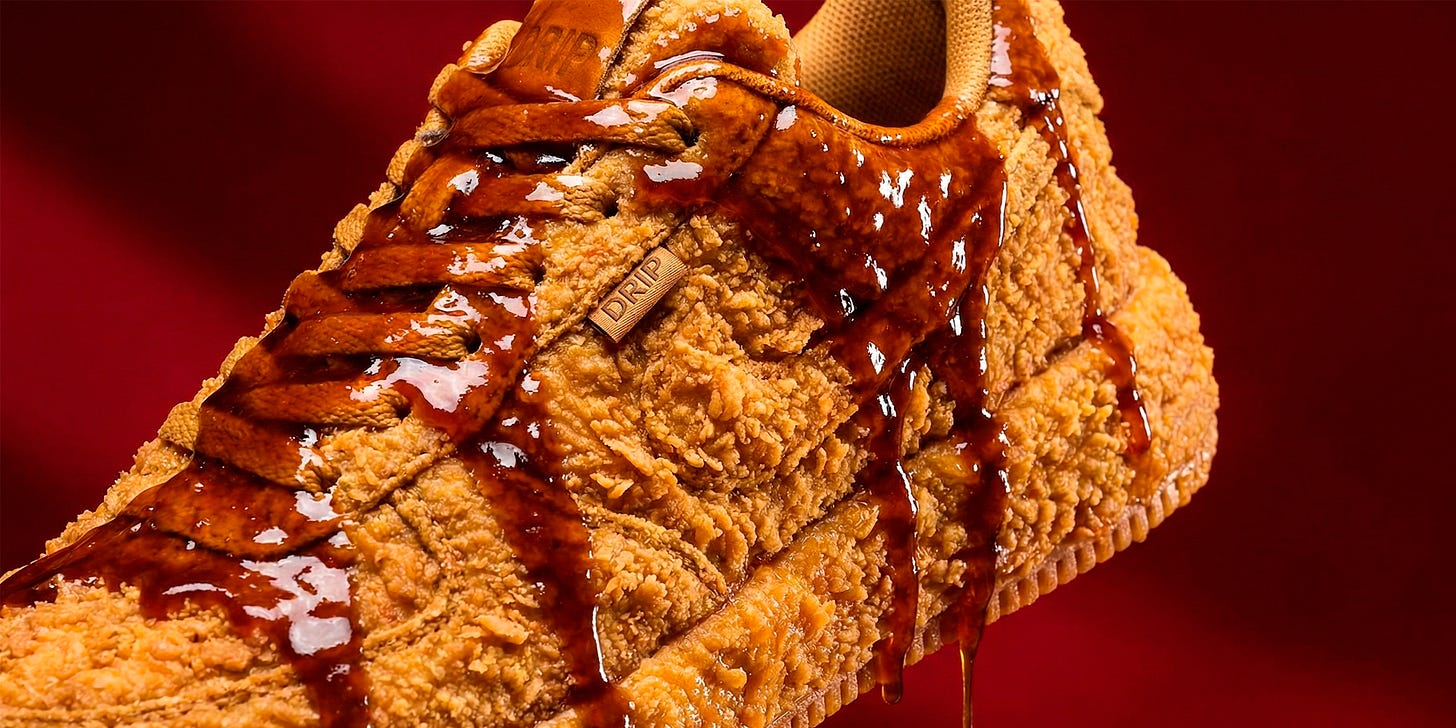 De um lado, a PUMA, sinônimo de performance e estilo urbano. Do outro, o KFC, um ícone global do fast food, com visual marcante e presença cultural consolidada. Essa collab poderia surgir como uma coleção limitada de sneakers com textura de frango, buckets personalizados e chaveiros de molho, avançar para uma campanha integrada com pontos de venda unificados ou até mesmo resultar em uma fusão completa, criando uma nova marca orientada pelo conceito de “fastwear”.