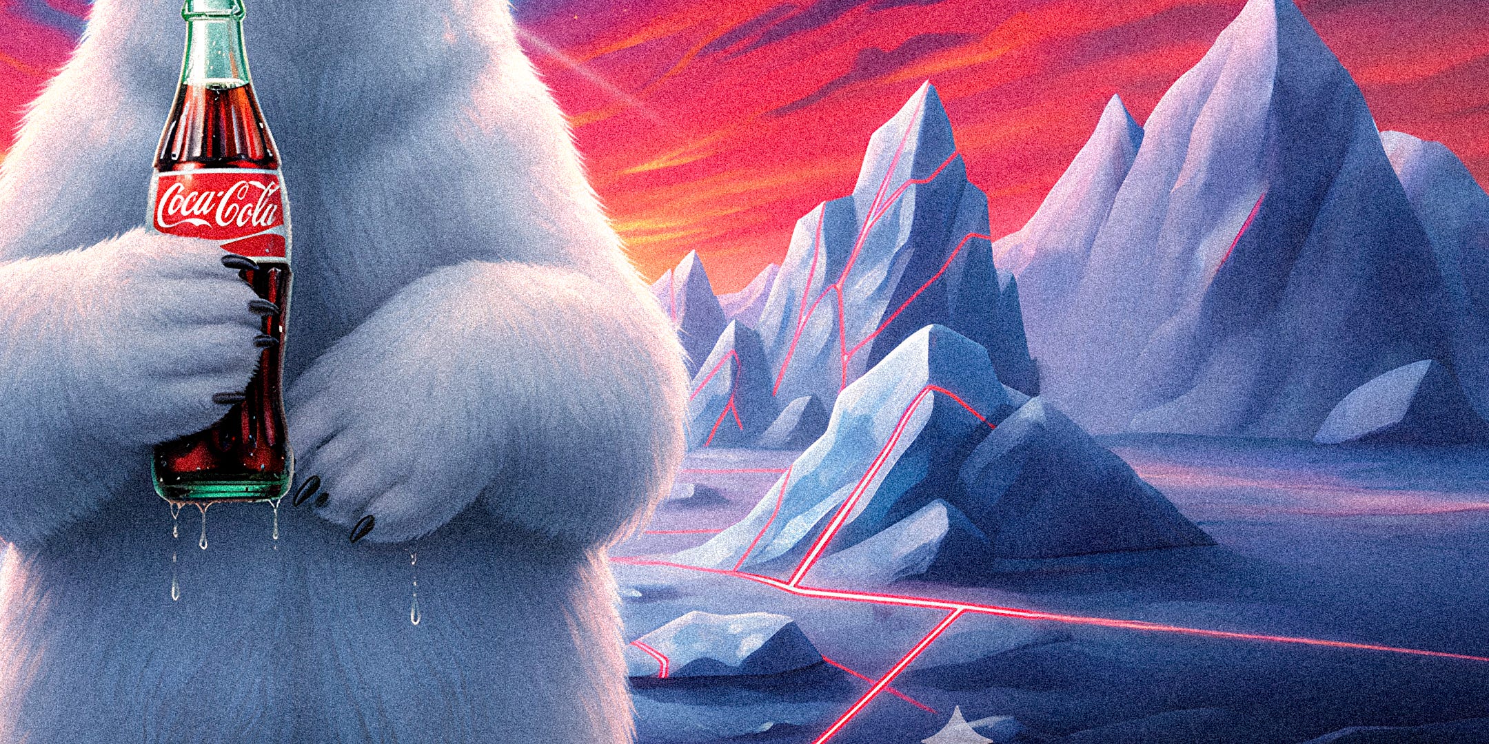 A Coca-Cola trazendo de volta o urso polar com uma estética cinematográfica retrô, cheia de neve artificial e filtro avermelhado.