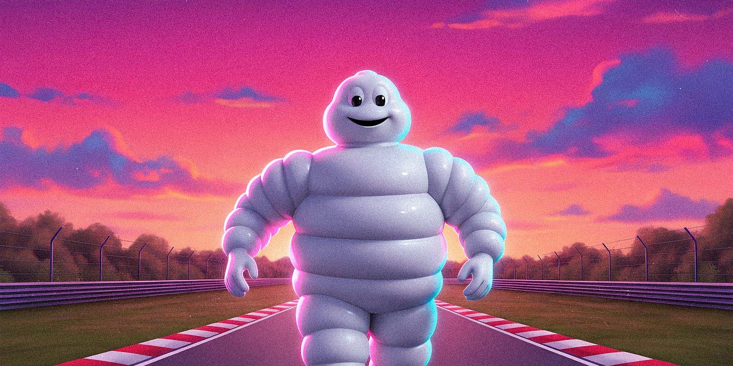 Imagine a Michelin usando o mascote de forma caricata em uma animação exagerada, como nas propagandas da época.