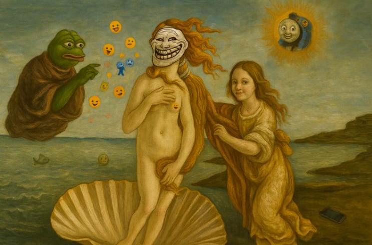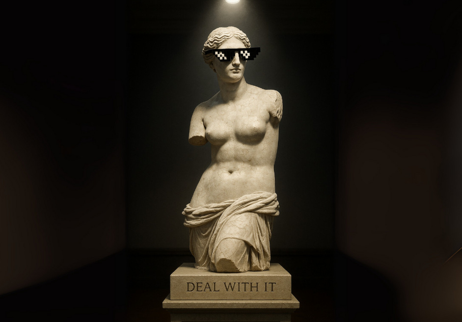 Imagina entrar no Louvre e, no lugar da Mona Lisa original, dar de cara com a versão “This is Fine”, olhando serena em meio ao caos. Ou então andar por corredores inteiros dedicados à história da internet e topar com a Vênus Trollface, orgulhosa, esbanjando ironia clássica.