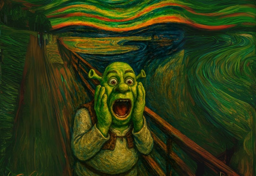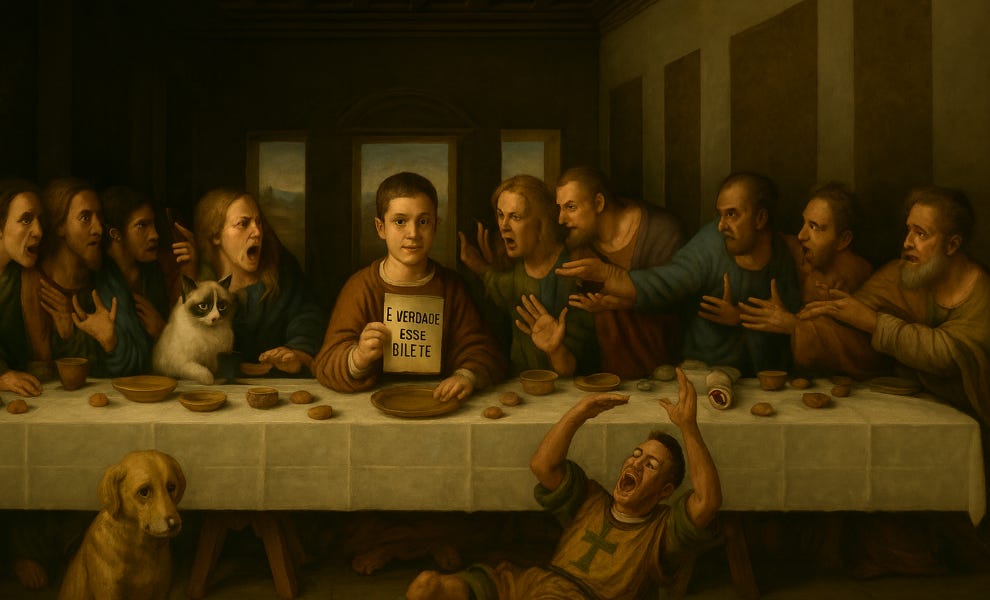 E claro, não podia faltar a Última Ceia do Zap, com cada apóstolo fixando o celular na mesa — nem o O Grito de Shrek, que transformaria o drama existencial em meme animado.