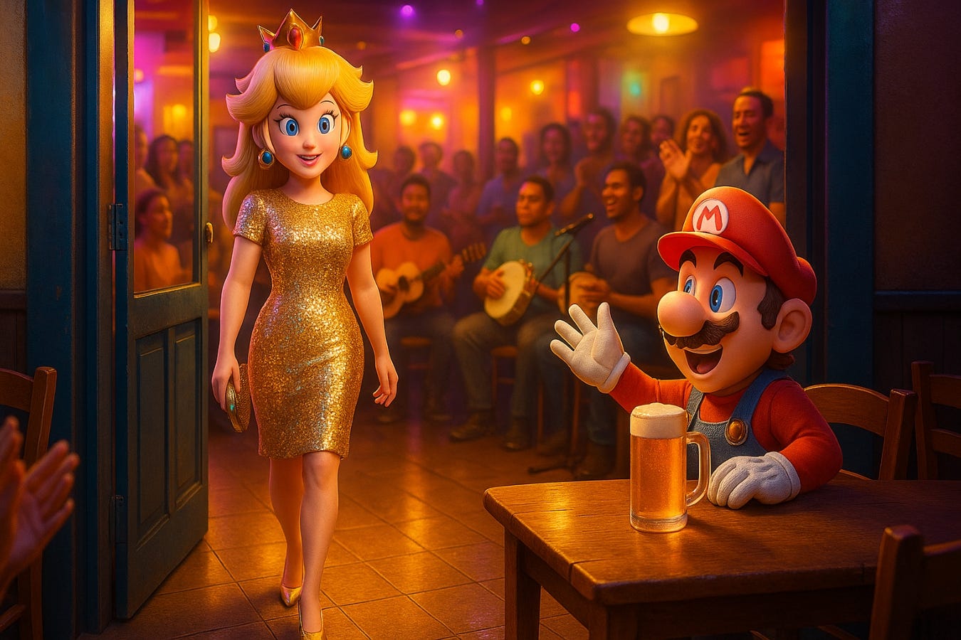 Imagina só: Peach chegando toda produzida pro pagodinho, Link pedindo “só uma água com gás” porque no outro dia tem dungeon pra explorar, Sonic virando energético no gargalo, e o Donkey Kong soltando a voz no karaokê com um clássico dos anos 90.