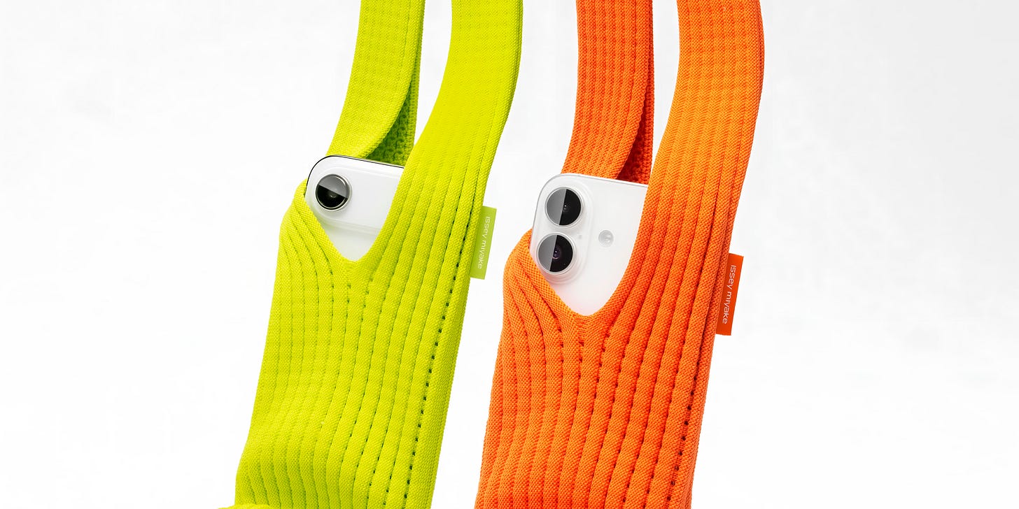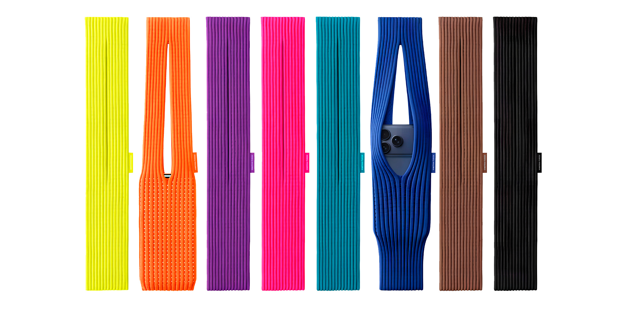 Produzido no Japão, o acessório tem construção contínua e elástica, que se adapta ao conteúdo e permite visualizar a tela do iPhone mesmo guardado. Pode ser usado na mão, no corpo ou amarrado à bolsa. A versão com alça curta chega em oito cores e a com alça longa, em três, todas pensadas para combinar com a linha atual de iPhones. A estética é discreta, mas cheia de personalidade.