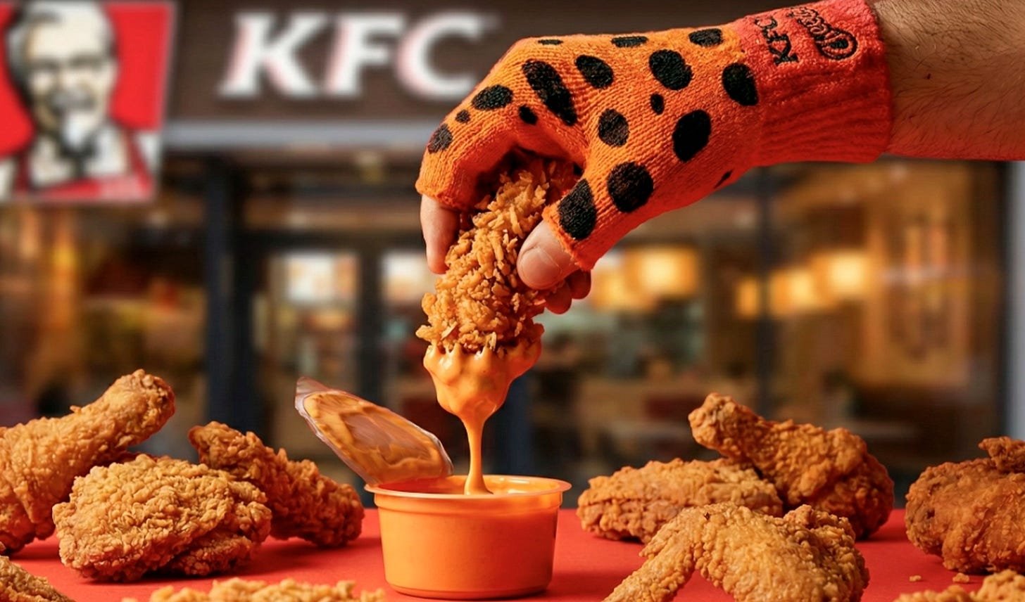 KFC e Cheetos se unem em collab e apostam em luvas para comer.