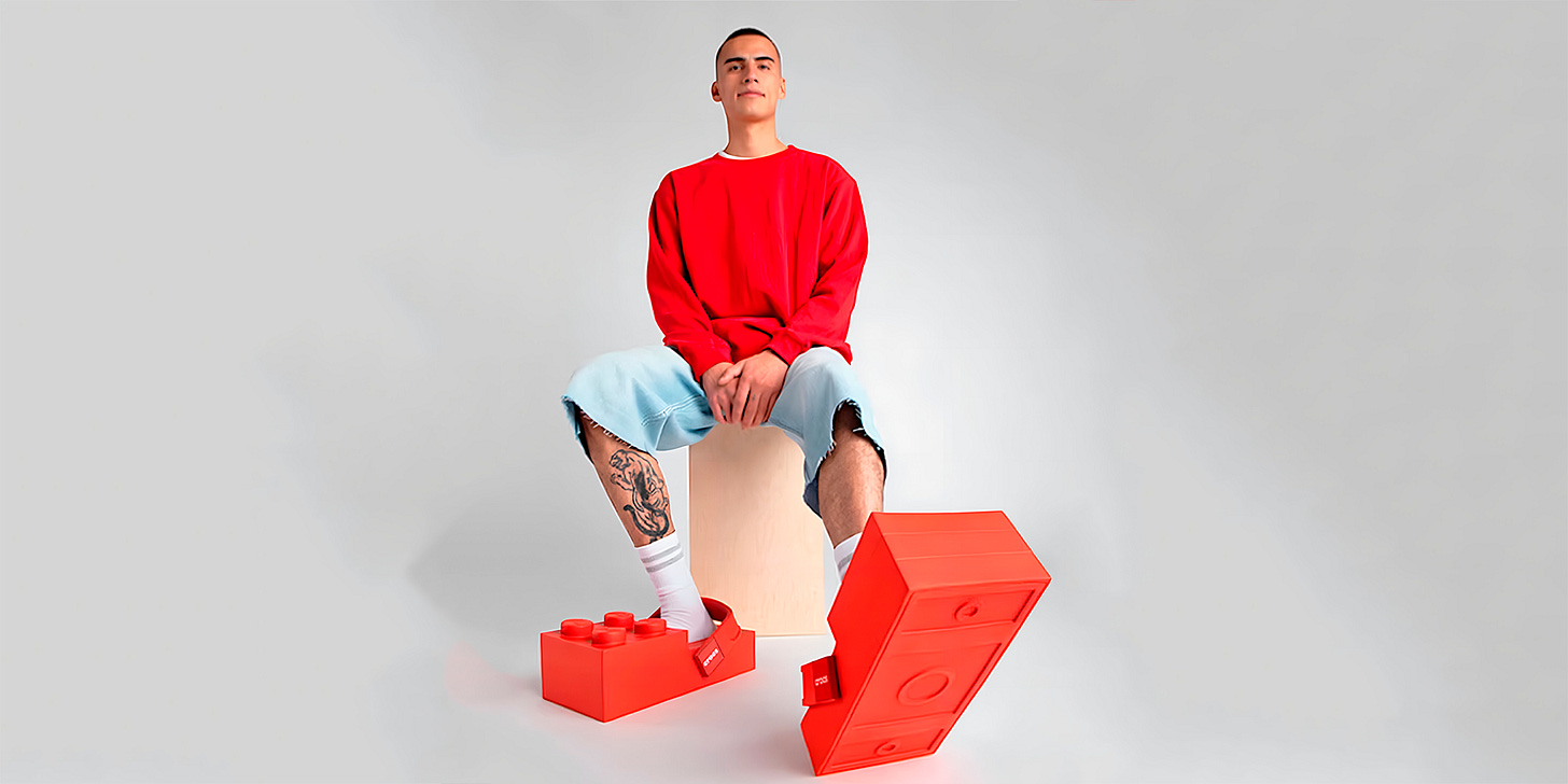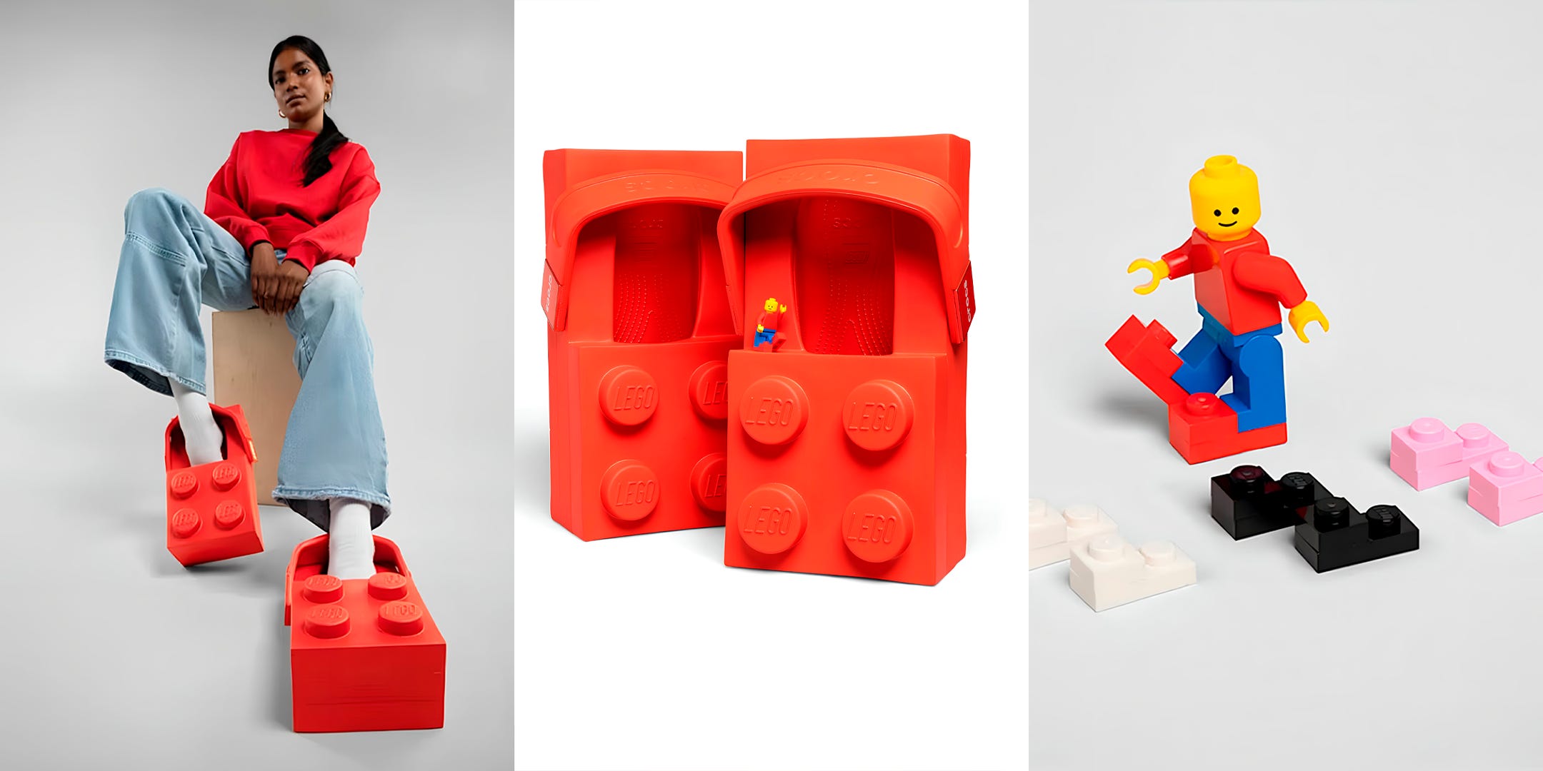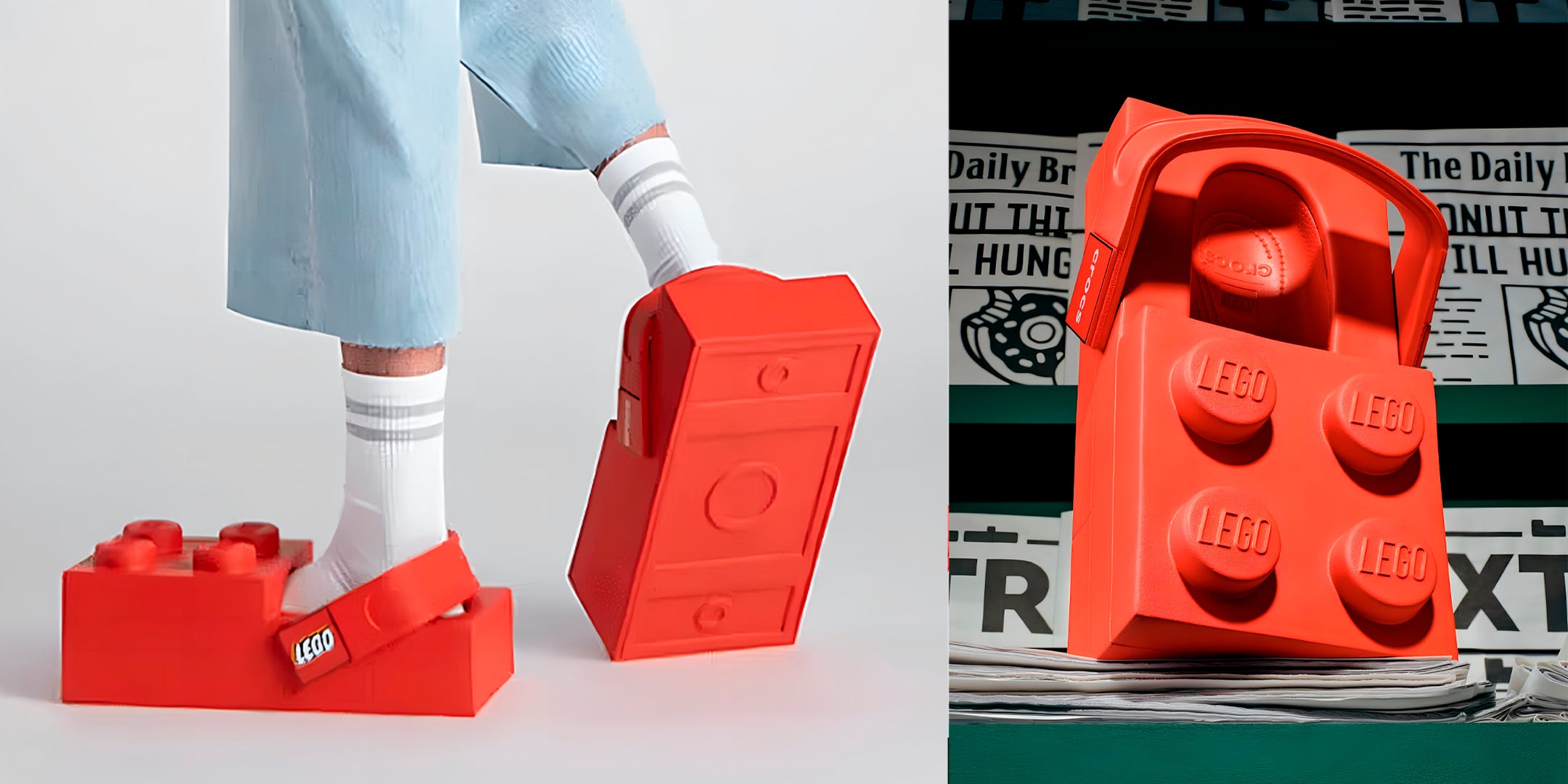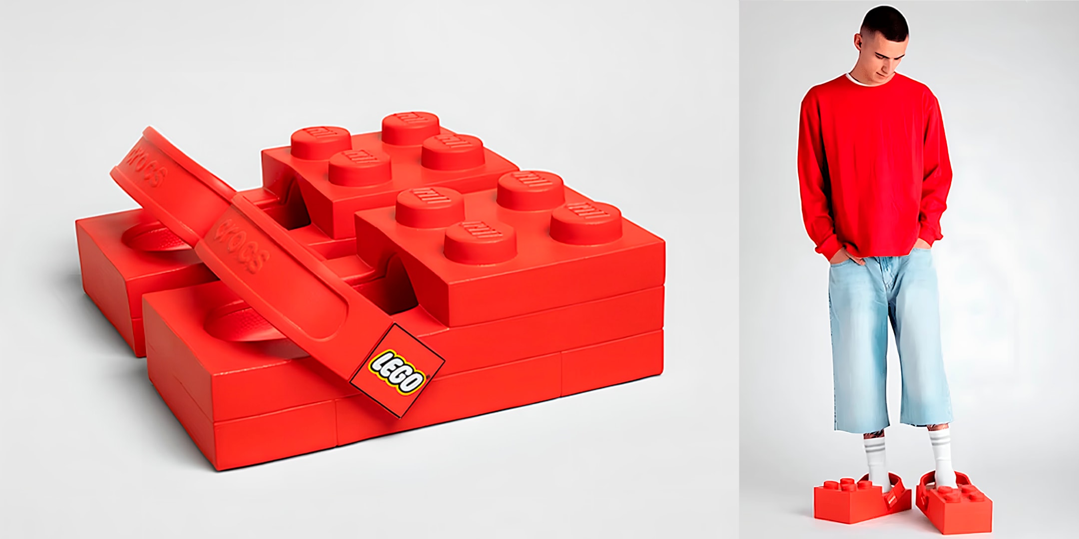 O lançamento que marca o início dessa parceria plurianual é o LEGO Brick Clog, um clog inspirado diretamente na forma de um bloco Lego. O design exagerado traz uma estrutura oversized que se assemelha à icônica peça vermelha, incluindo quatro studs estampados com o logotipo Lego e um solado que imita a textura de um brick.
