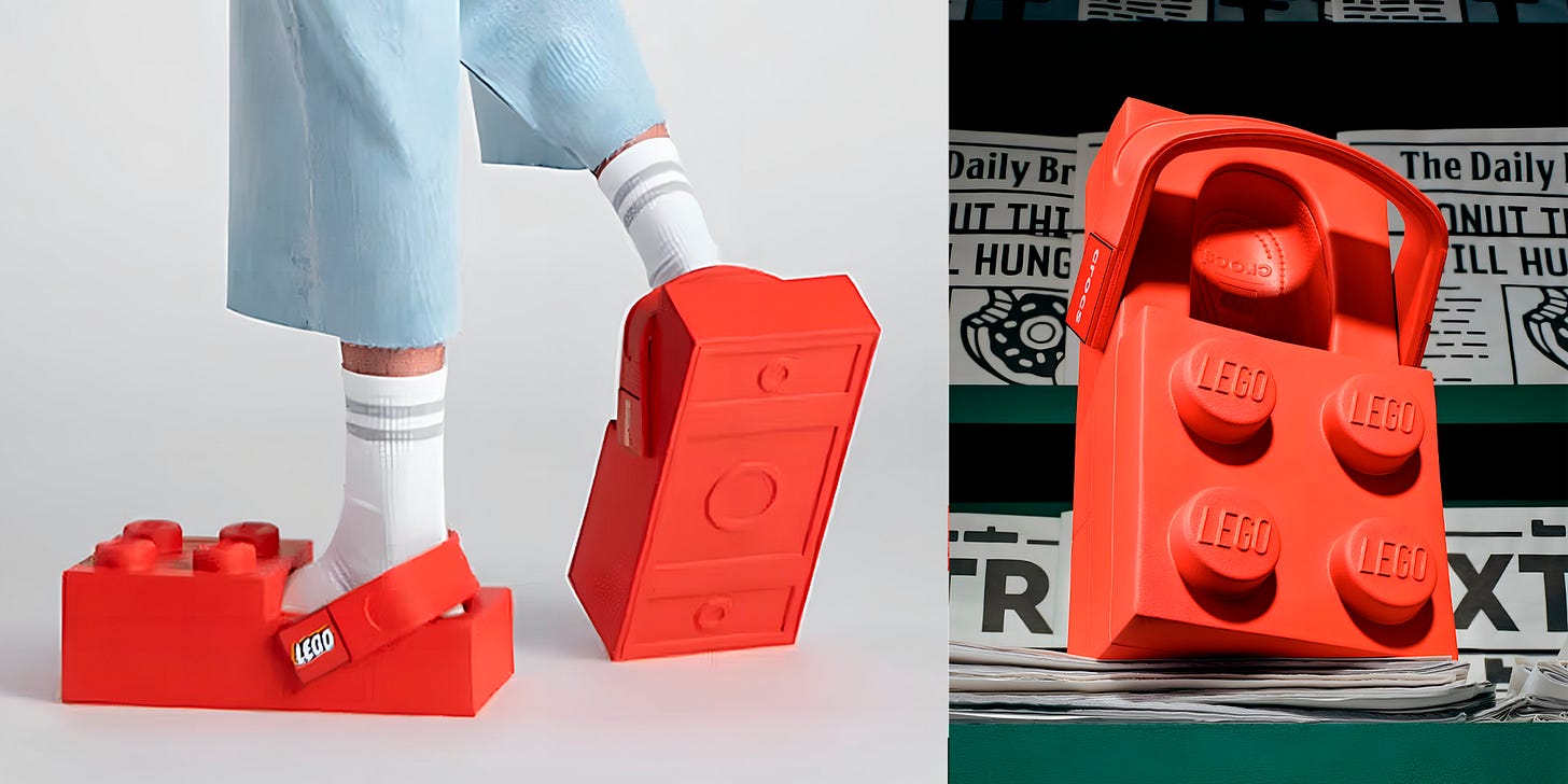 Lego e Crocs: quando blocos icônicos viram calçados colecionáveis.