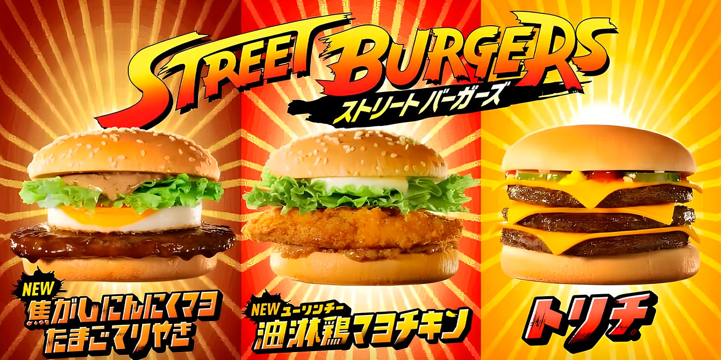 Em outubro de 2025, o McDonald’s Japão lançou sua primeira colaboração oficial com a franquia Street Fighter, da Capcom. A campanha traz um menu temático com três hambúrgueres inspirados nos personagens Ryu, Chun-Li e Ken, todos figuras icônicas do universo dos games desde a década de 90.