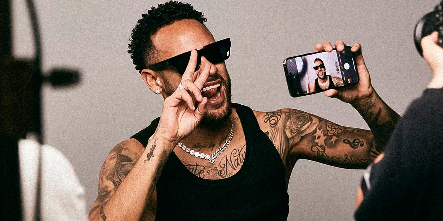 A construção da imagem pública de Neymar extrapola o futebol. Ao longo da carreira, ele manteve sua presença consistente, de desfiles de alta costura a campanhas de grandes marcas globais.