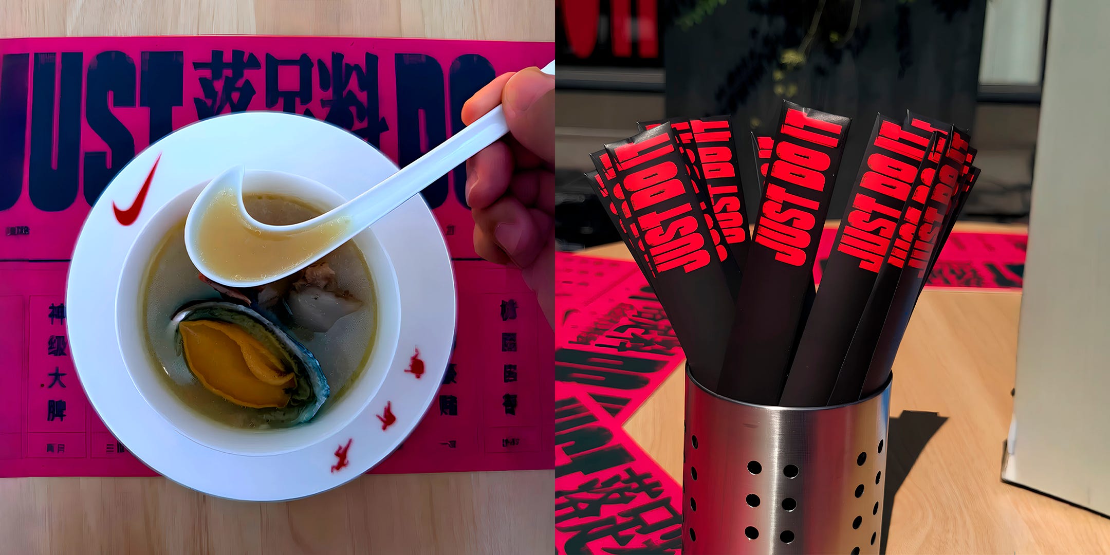 A ação chamou atenção por servir sopas com ingredientes típicos da culinária cantonesa, como casca de tangerina seca e melão amargo, tudo com a identidade e estética da marca, até a colher traz o famoso “swoosh”, criando uma conexão sutil com o universo da marca.