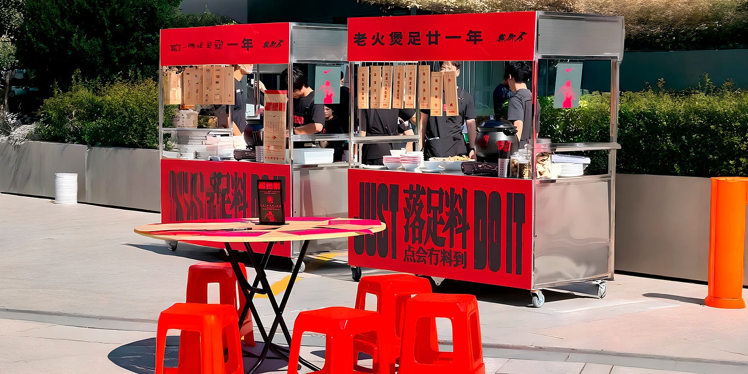Em Guangzhou na China, a Nike decidiu inovar de forma ousada. Em vez de lançar um novo produto esportivo, a marca inaugurou uma pop-up de sopas tradicionais na ilha de Ersha, ponto de encontro de corredores e praticantes de atividades físicas.