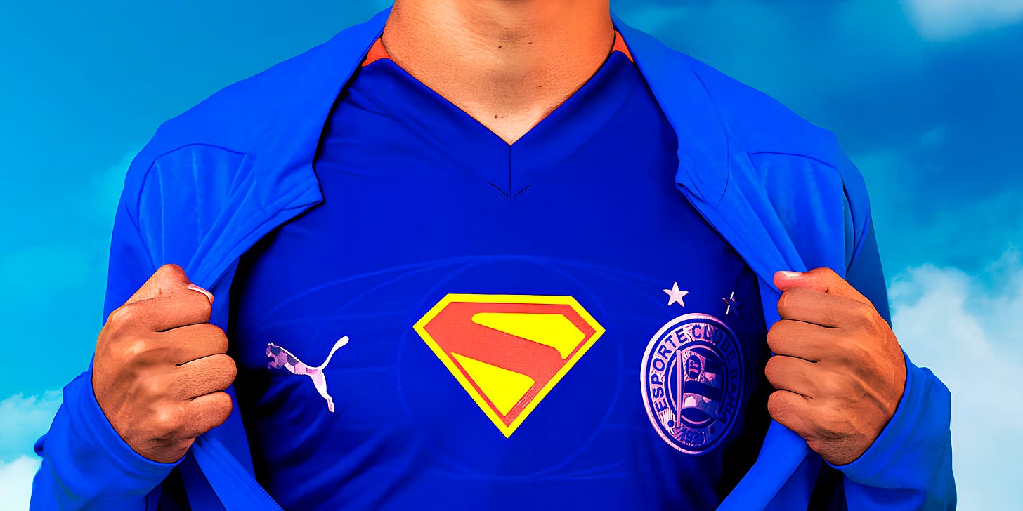 O ponto de partida dessa collab foi tão simples quanto genial: o mascote do Bahia, criado por Ziraldo, sempre carregou elementos visuais que remetem ao Superman.