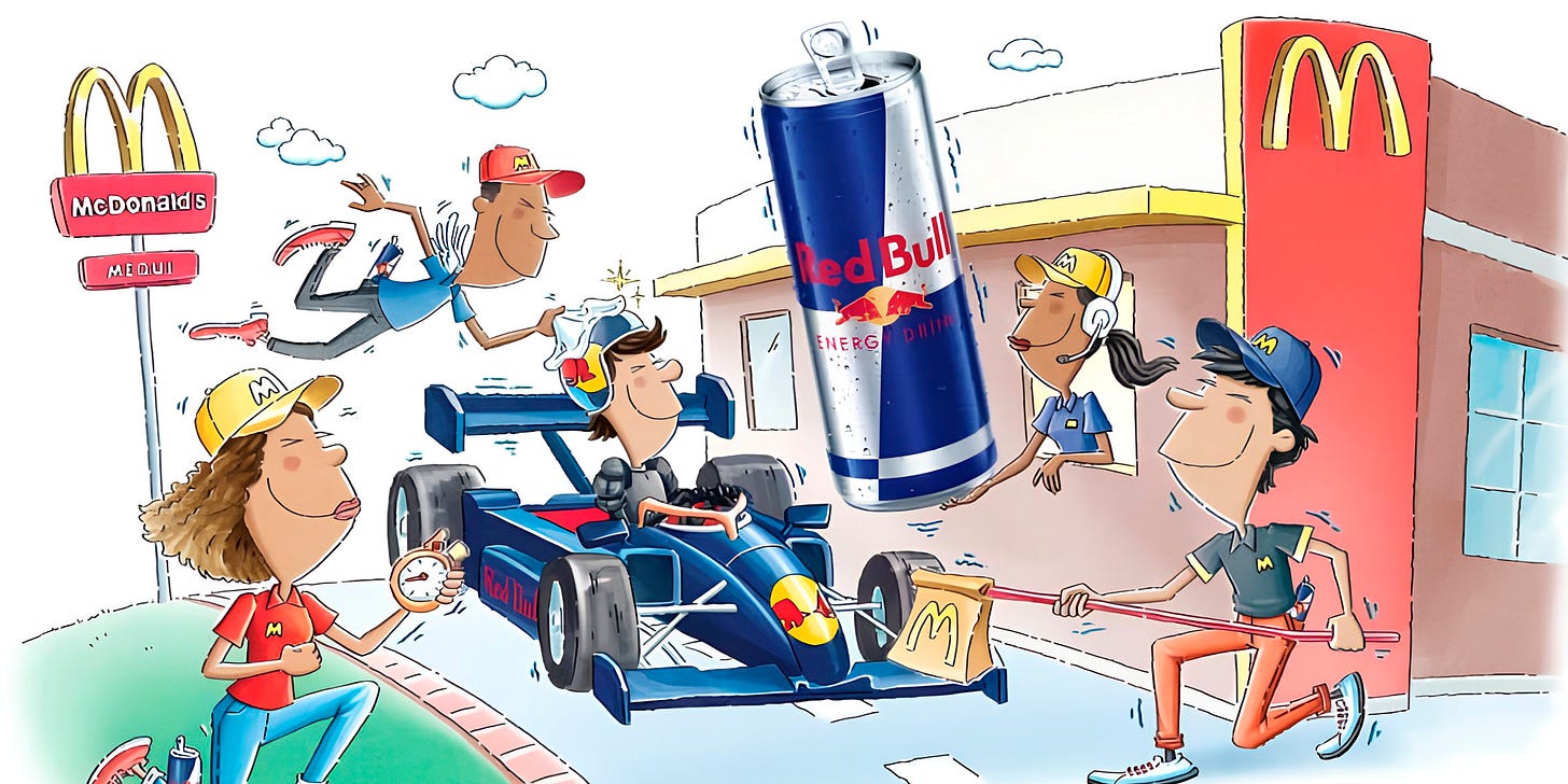 Esse case mostra como duas marcas com personalidades distintas, uma associada a velocidade, adrenalina e estilo de vida jovem, a outra a conveniência, escala e familiaridade, podem se complementar de modo estratégico e coerente.