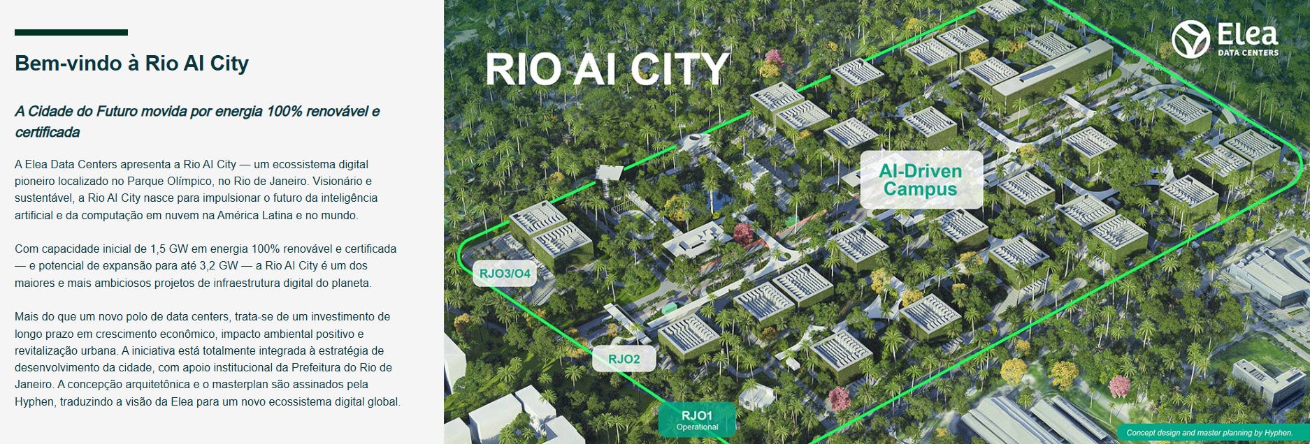 O Rio AI City será um mega campus de data centers alimentado por 100% de energia limpa, com sistemas de resfriamento sem uso de água — tecnologia essencial para reduzir impacto ambiental em operações desse porte.
