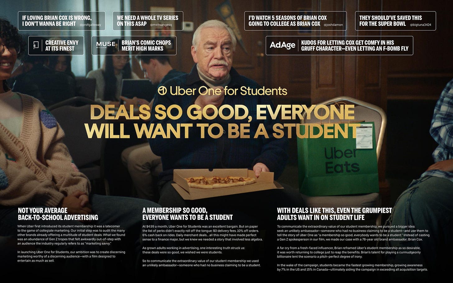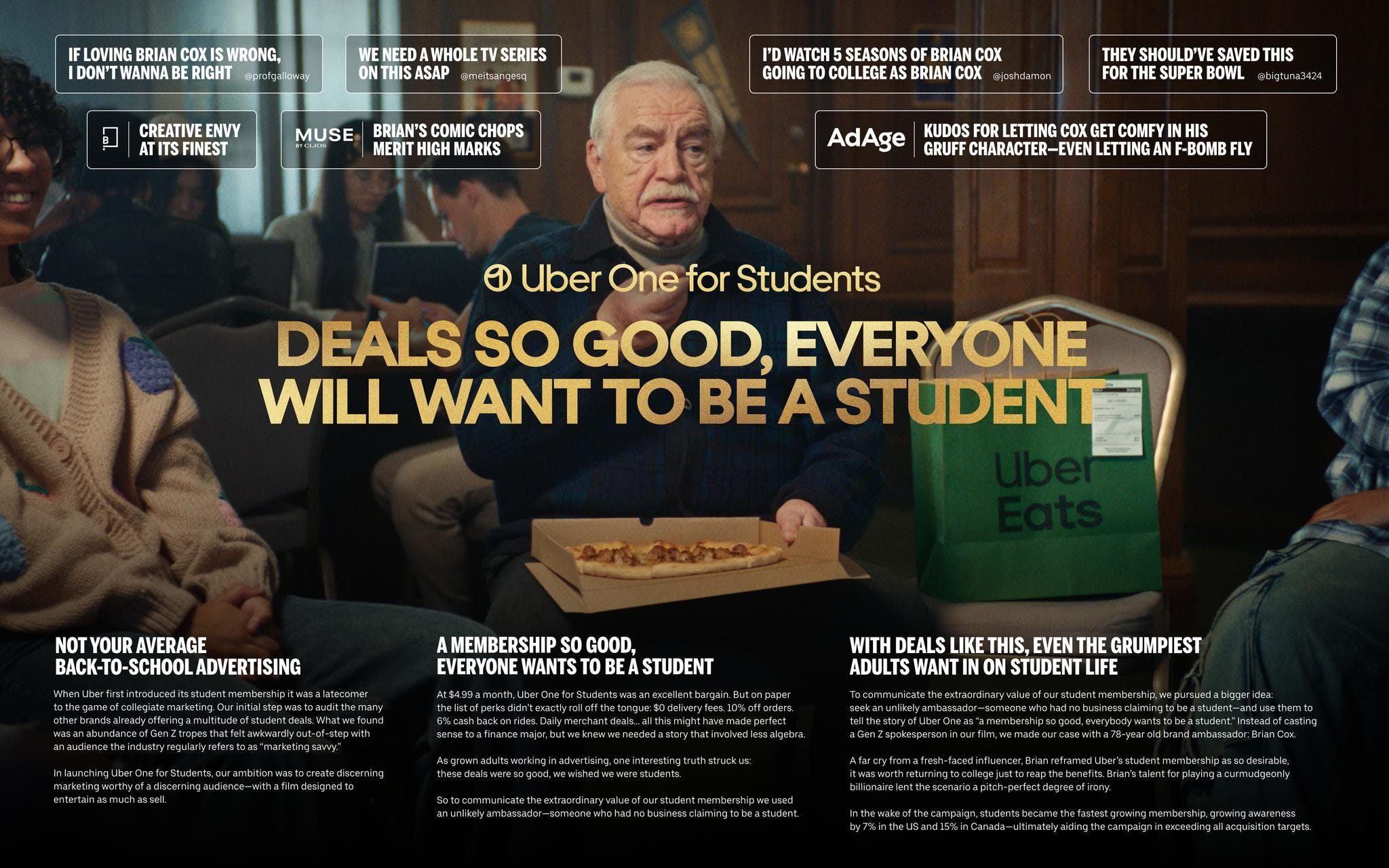 Mais do que uma peça divertida, o filme mostra a capacidade da Uber de traduzir propostas de valor em storytelling envolvente. O Uber One for Students é um programa pensado para o público jovem, oferecendo vantagens como refeições com desconto e corridas mais baratas — benefícios que se conectam diretamente ao estilo de vida universitário.